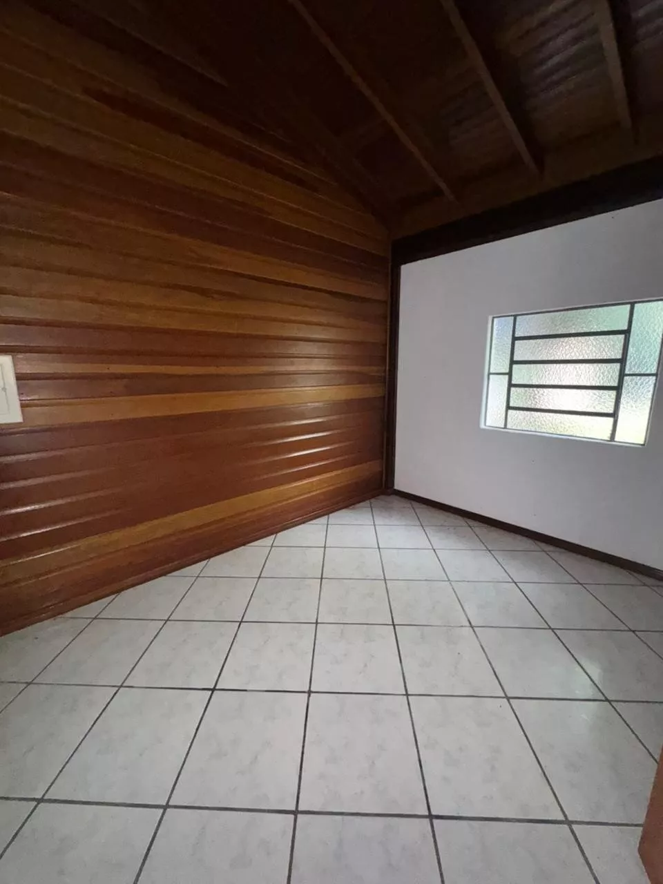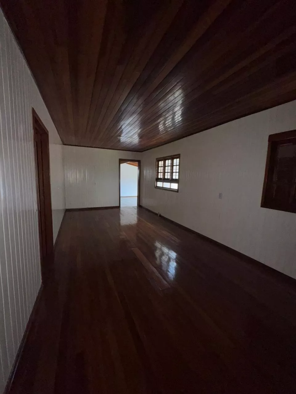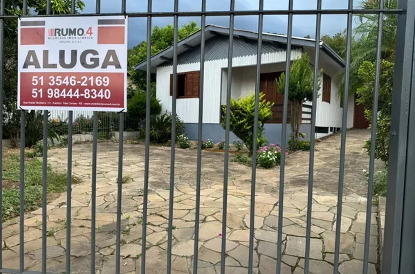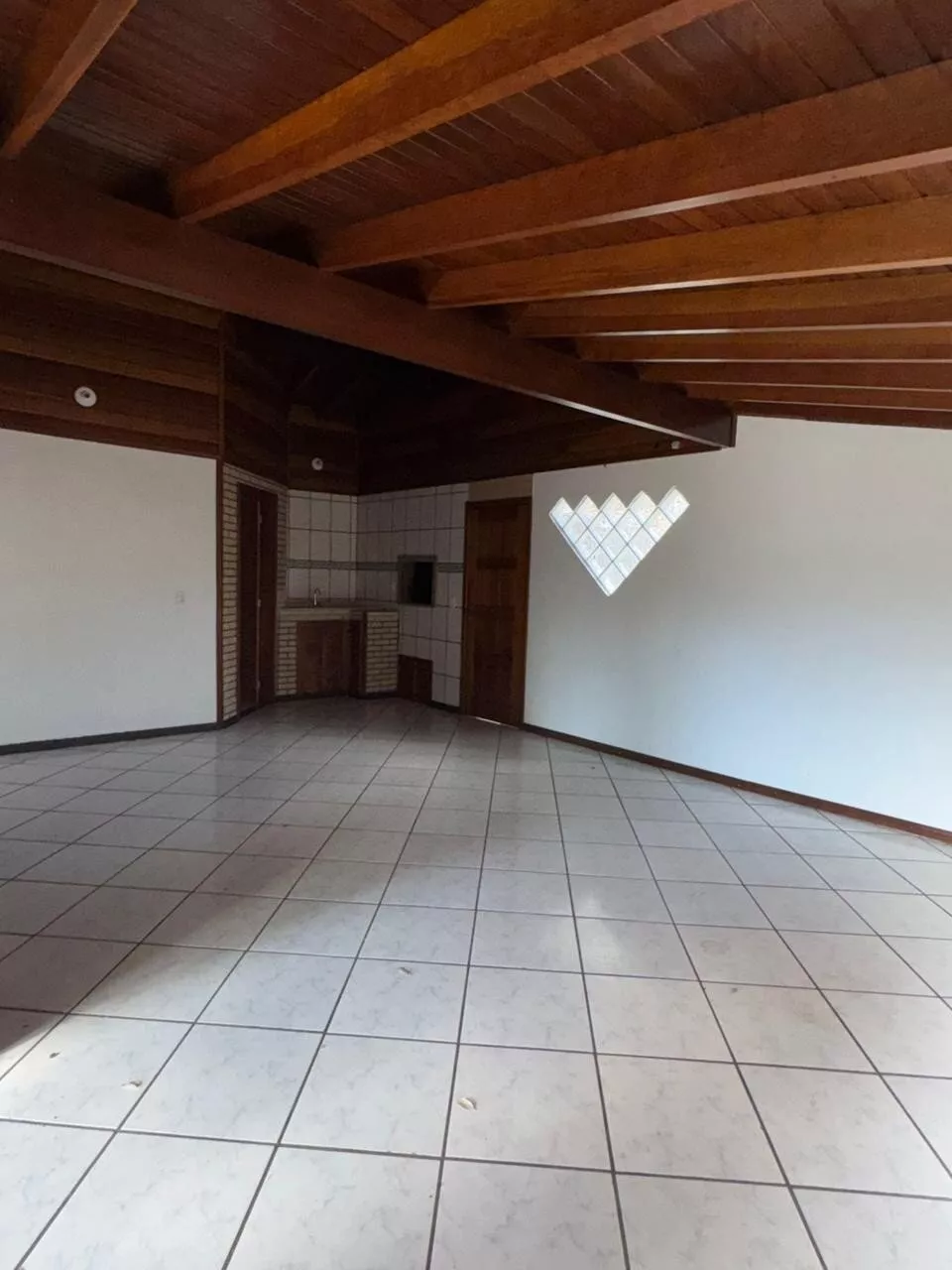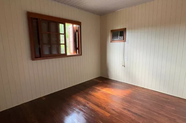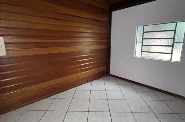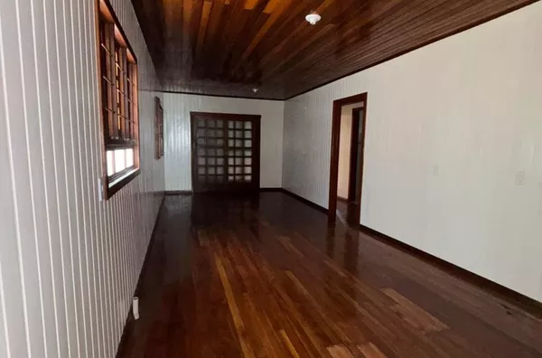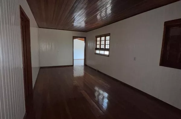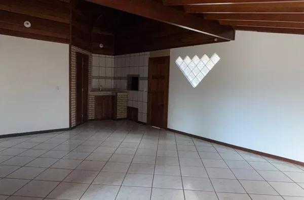 Casa de construção mista (alvenaria e madeira) composta por sala de estar e cozinha integradas, três dormitórios, 2 banheiros, área de serviço, depósito e área de salão de festas.