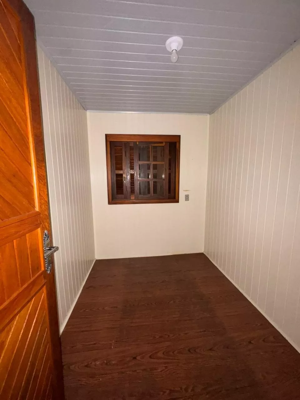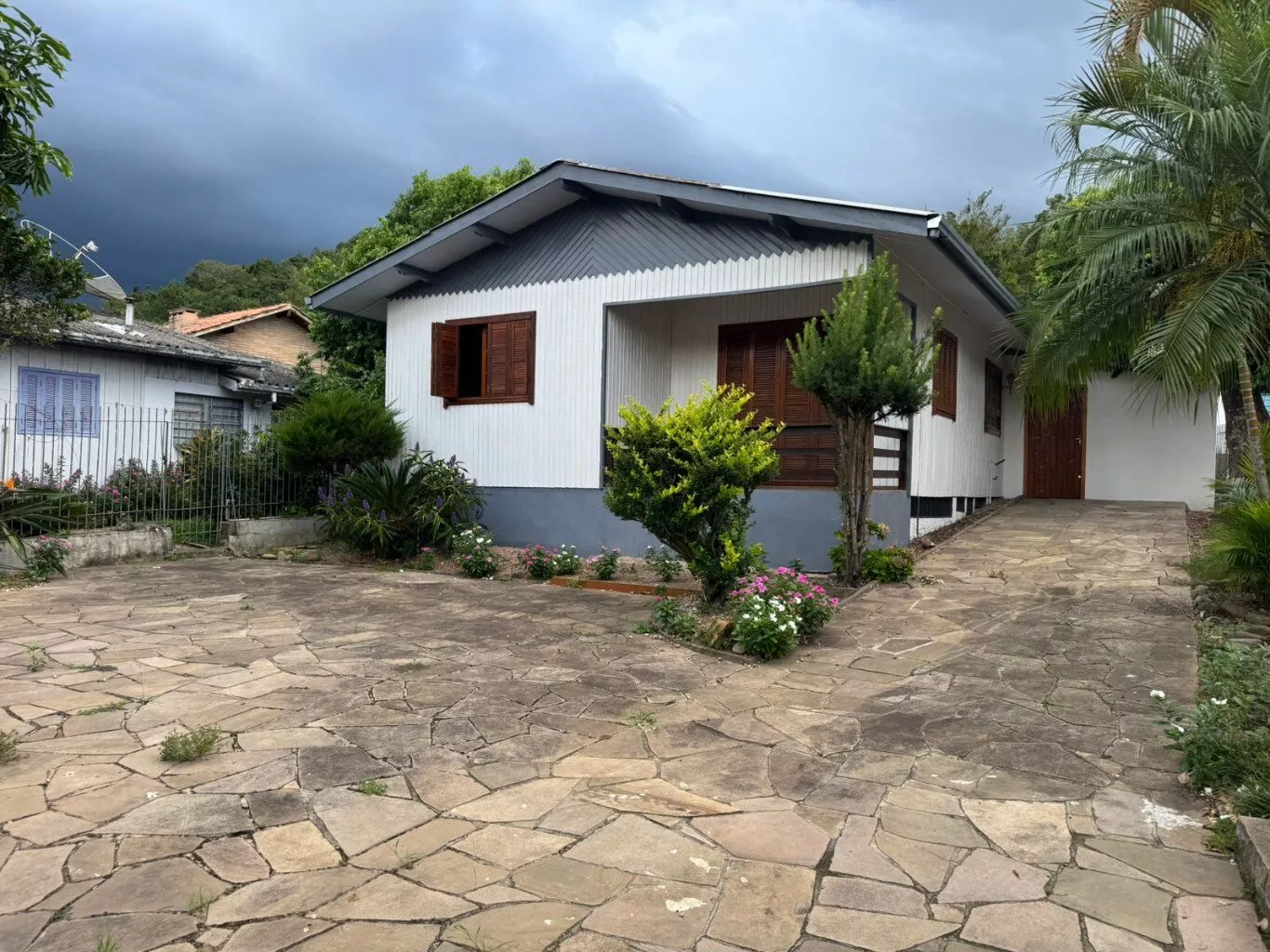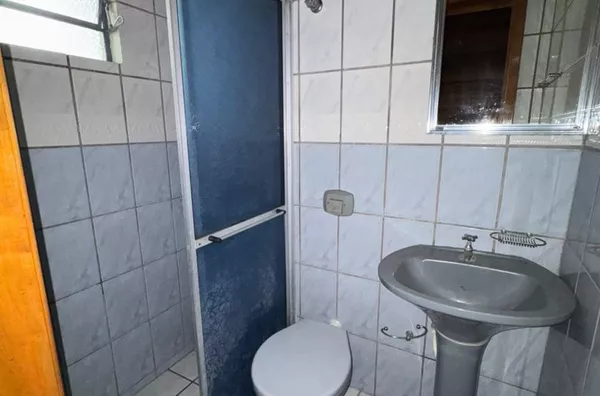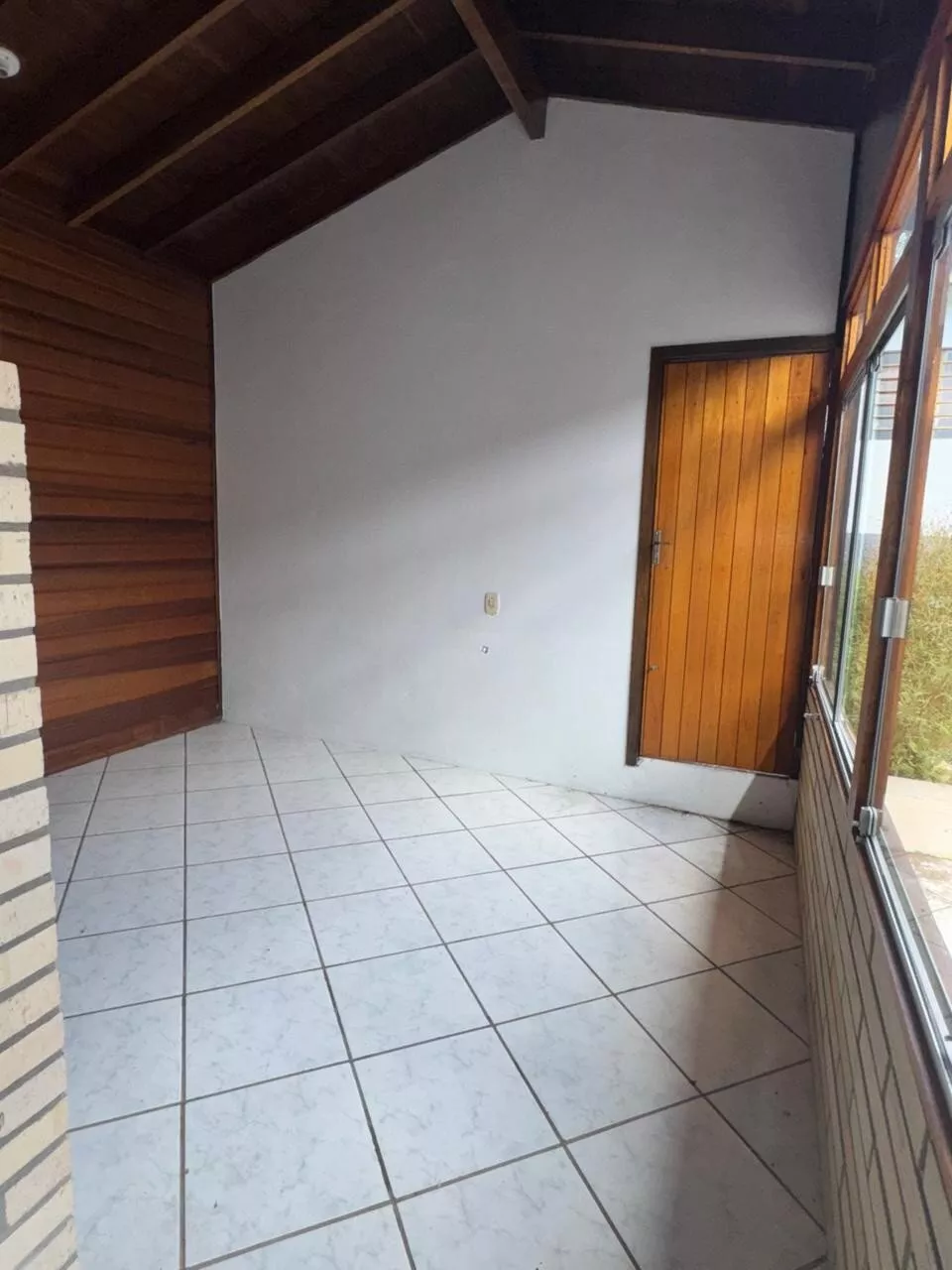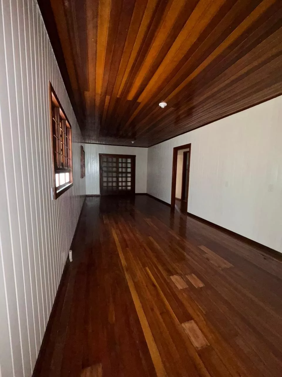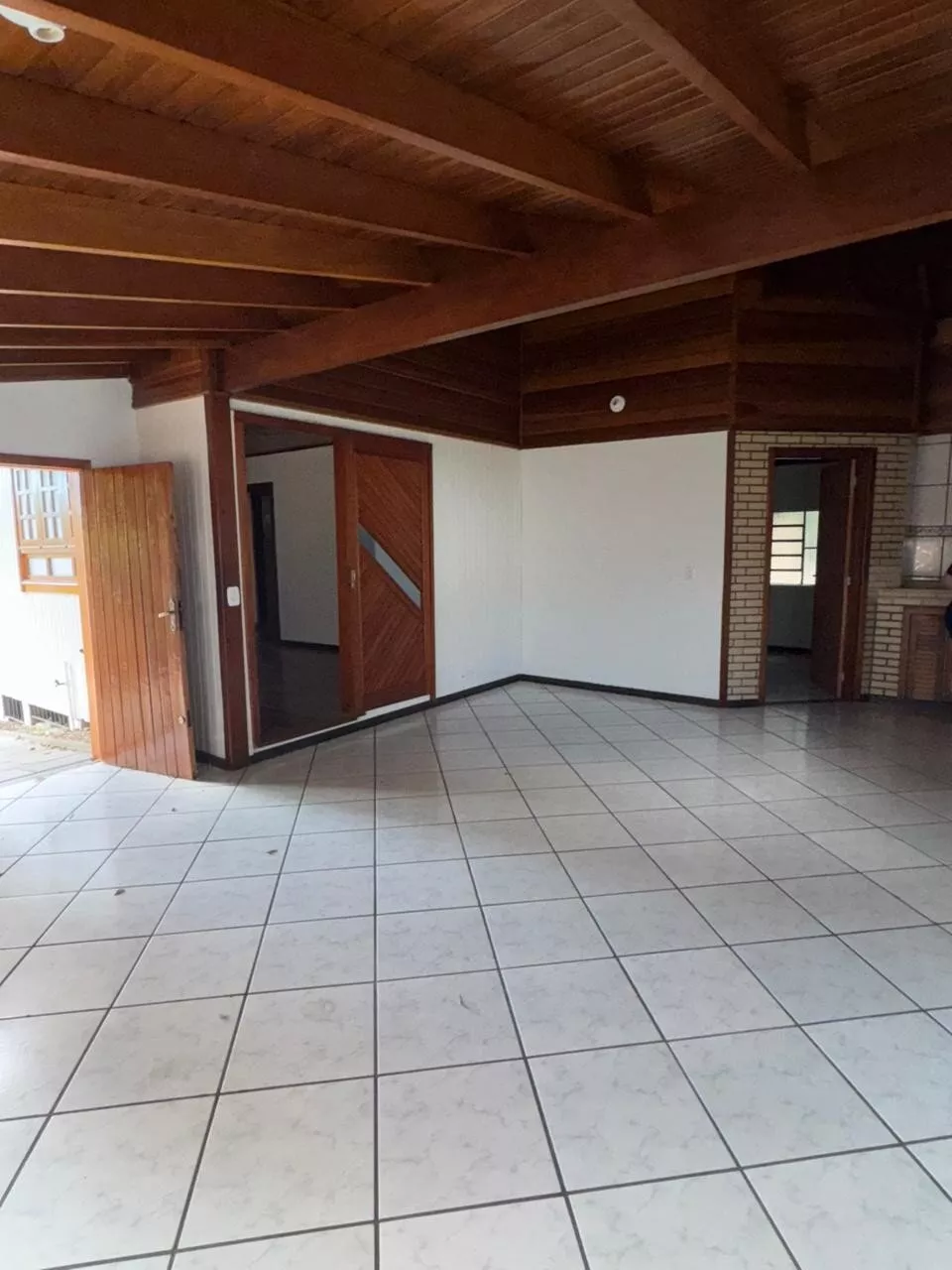Casa de construção mista (alvenaria e madeira) composta por sala de estar e cozinha integradas, três dormitórios, 2 banheiros, área de serviço, depósito e área de salão de festas.