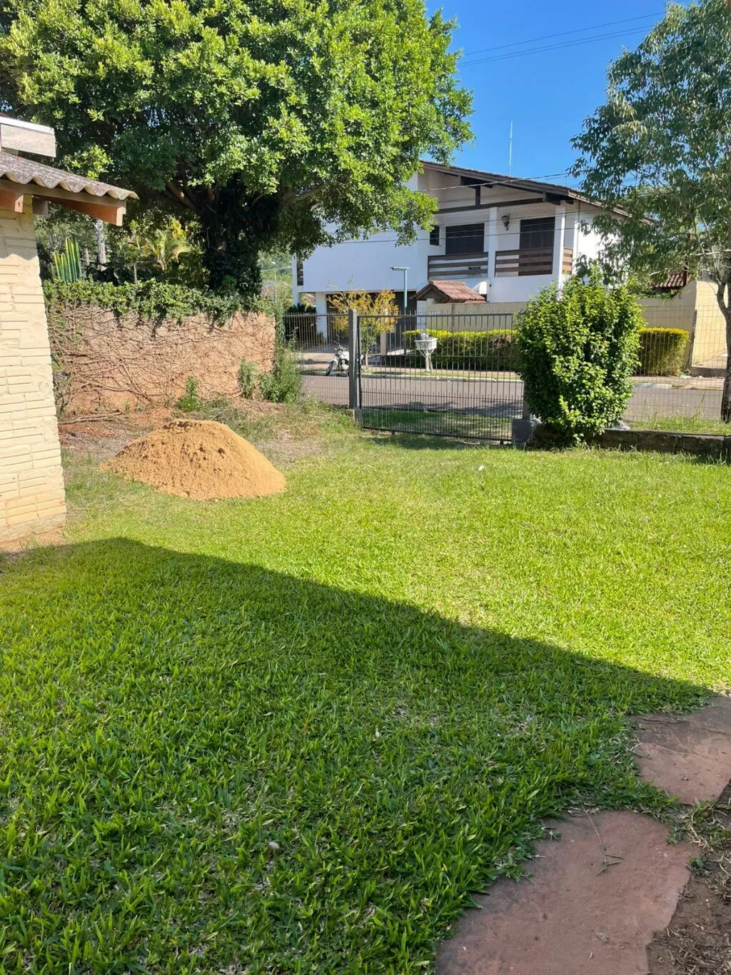 Pátio todo cercado com tela, grades e mourões.