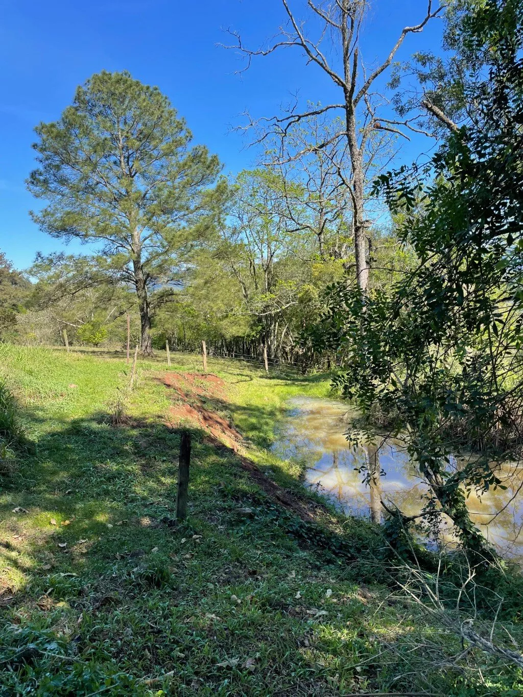 Terreno todo cercado, açude, e algumas plantas já brotando.