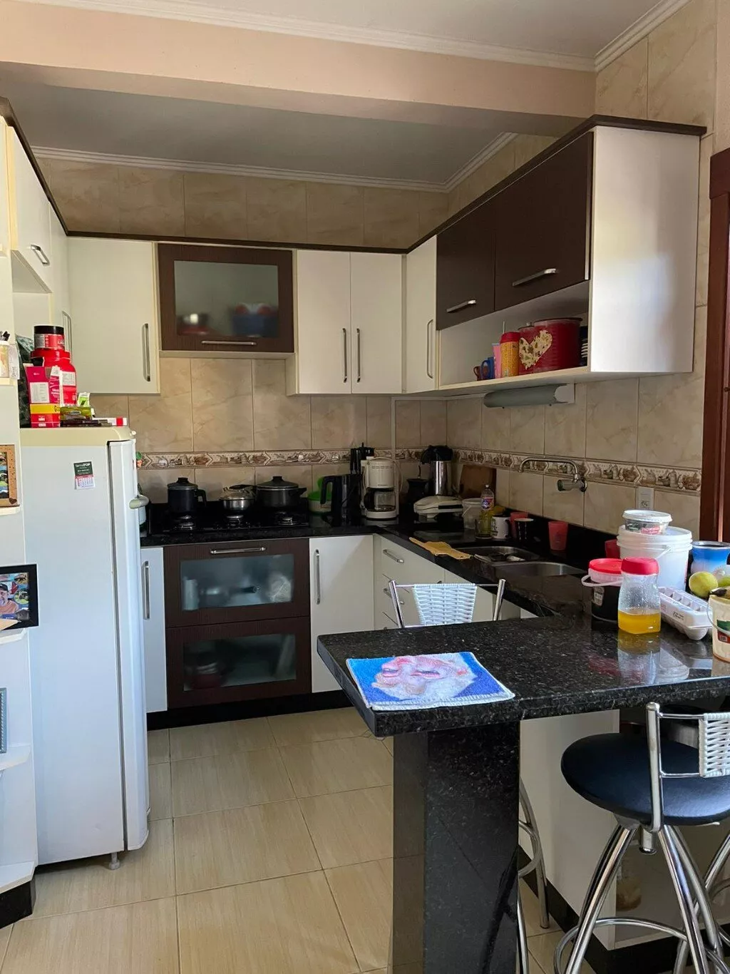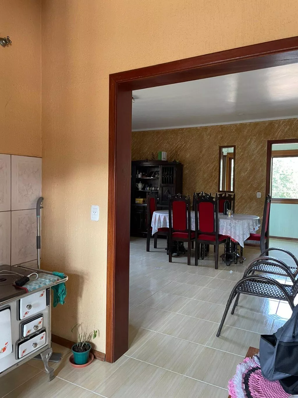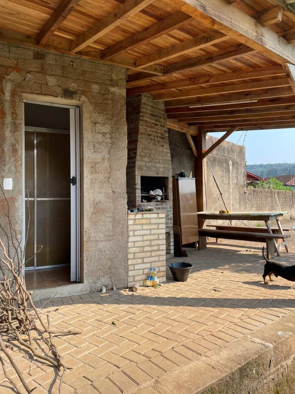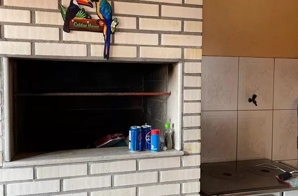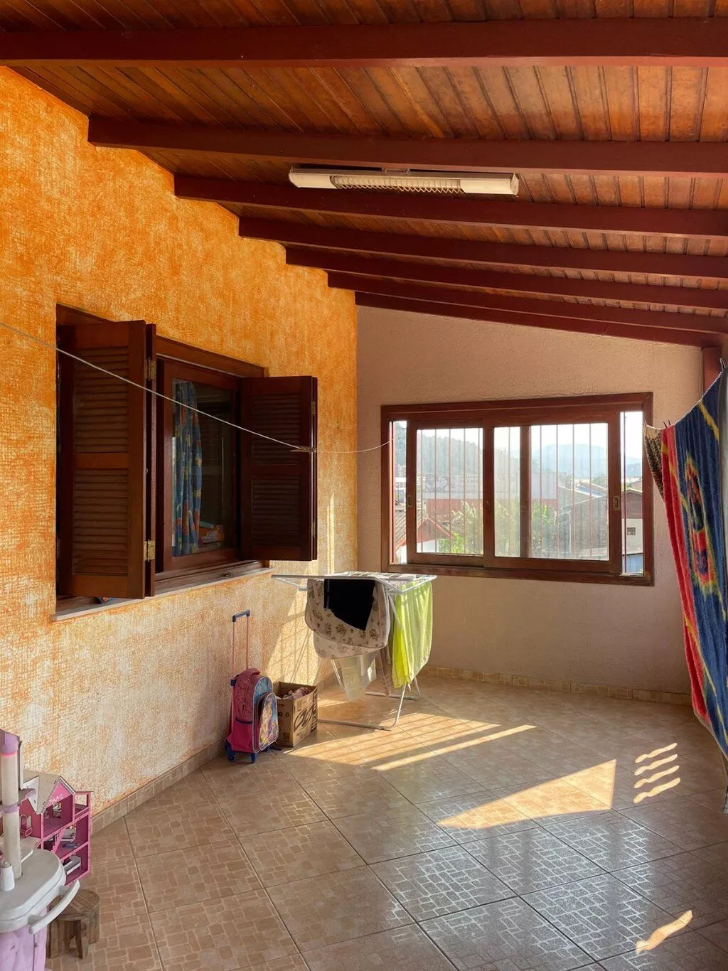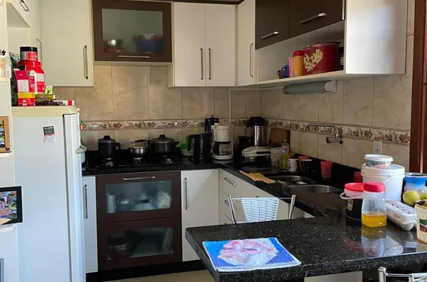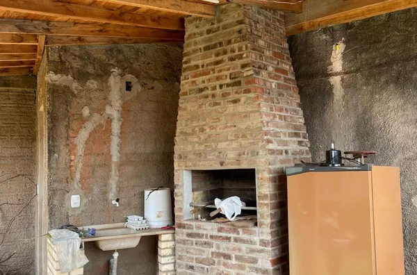 Pavimento superior, com sala de estar, cozinha e jantar integrados + churrasqueira, 3 dormitórios (sendo 1 suíte), banheiro social, lavanderia, varanda.
