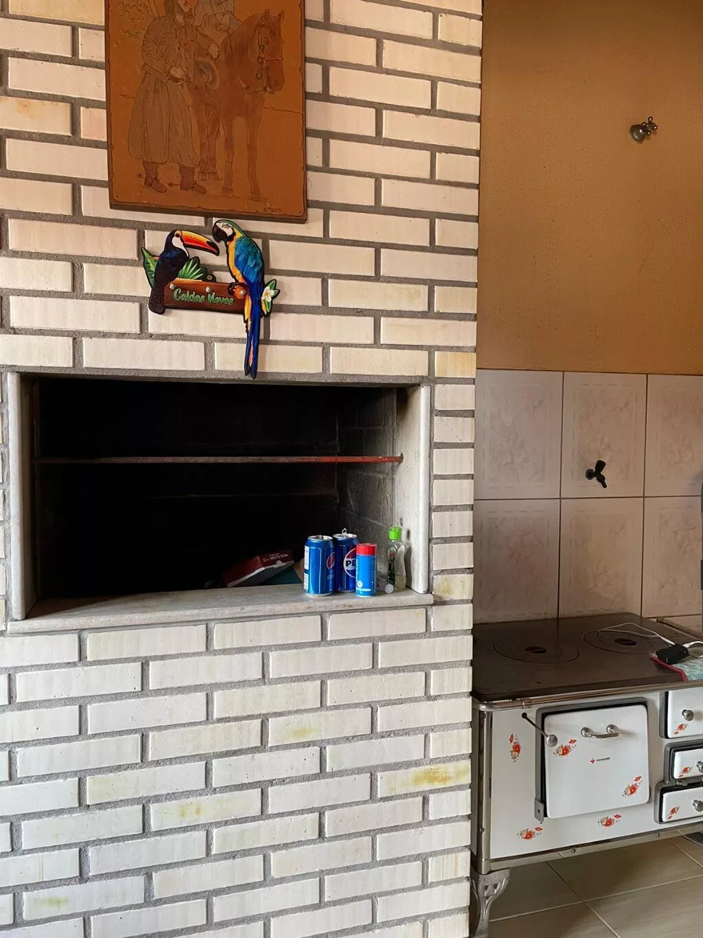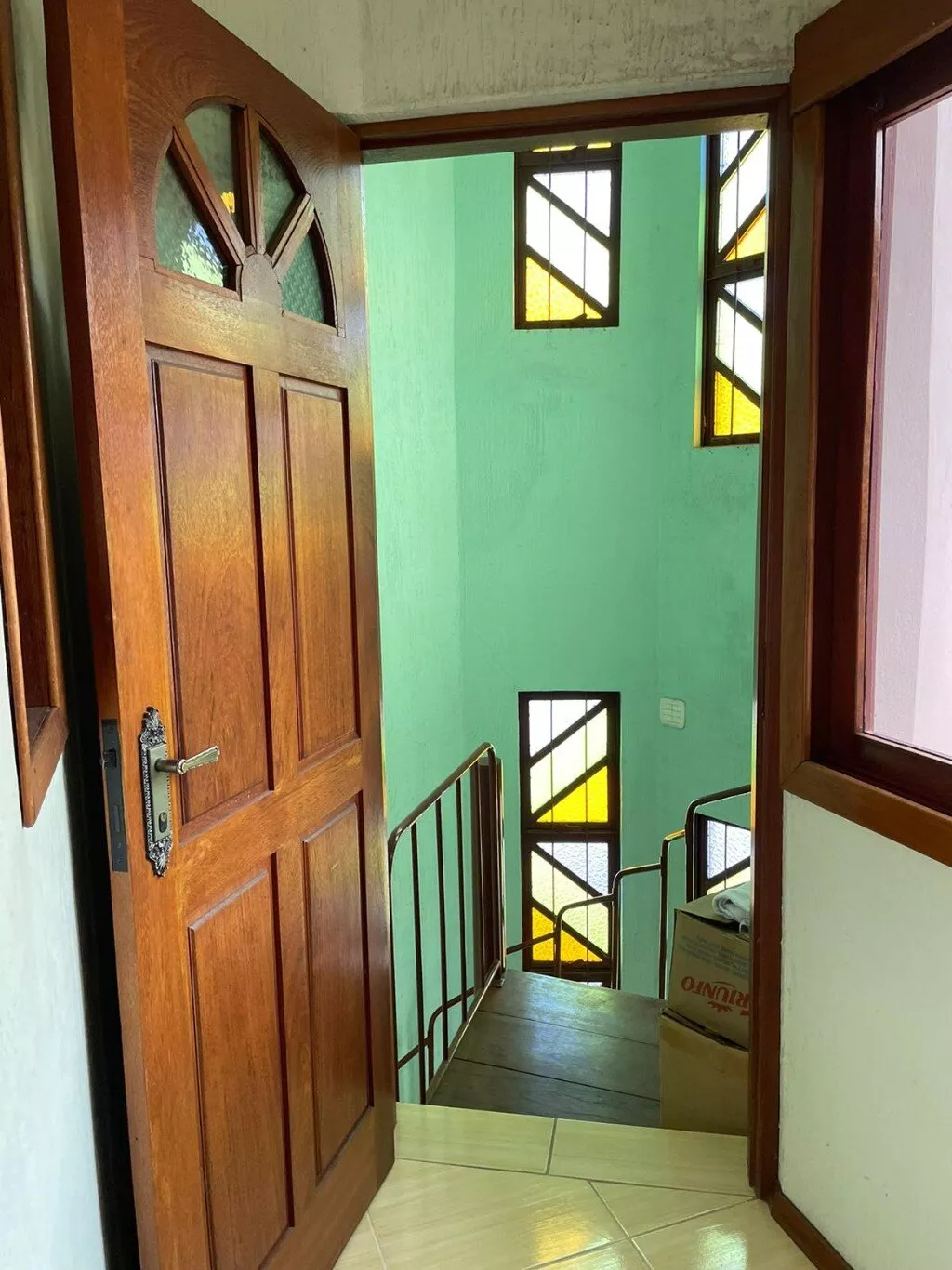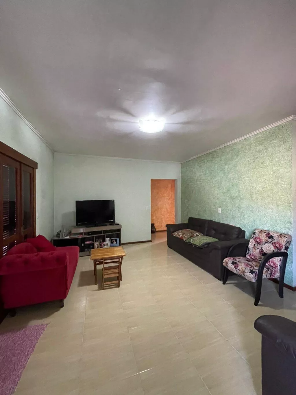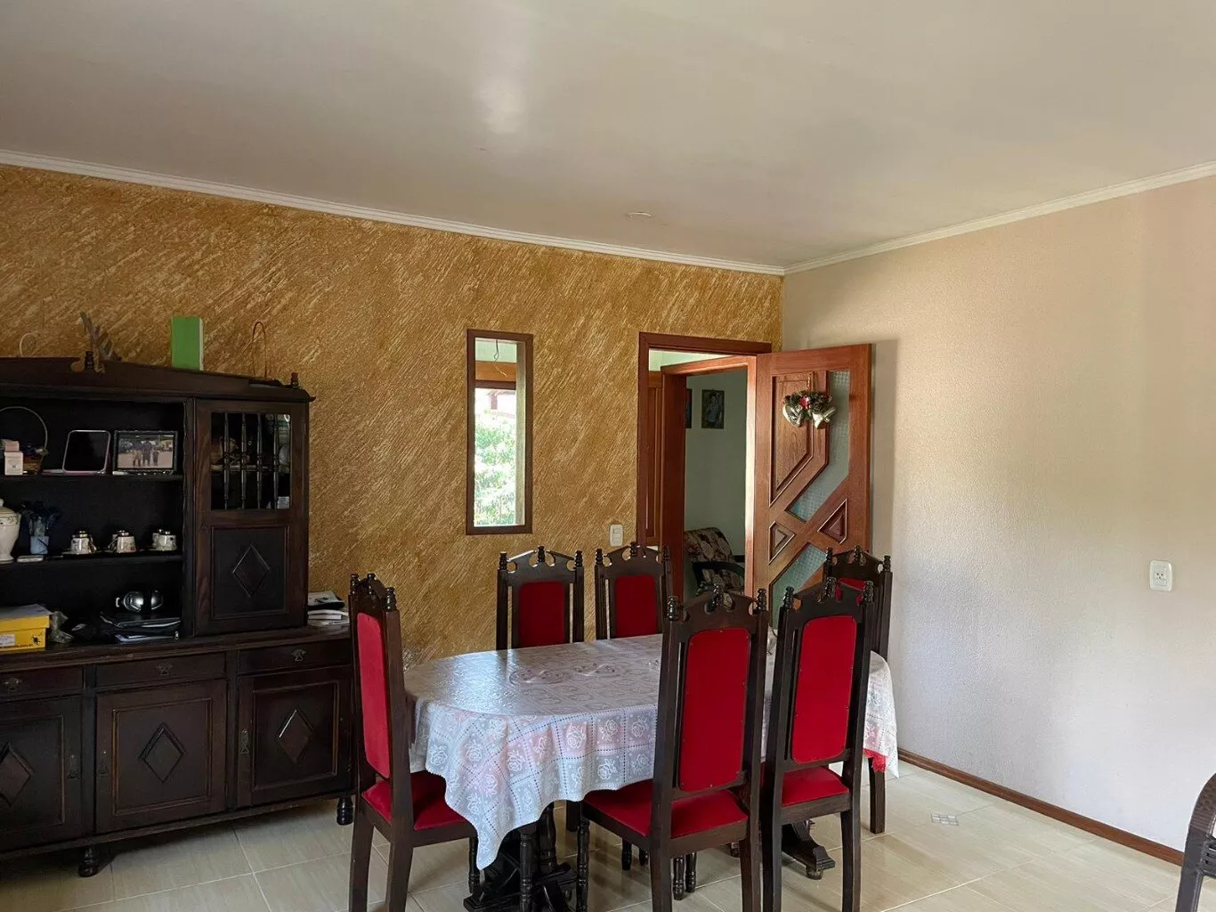 Pavimento superior, com sala de estar, cozinha e jantar integrados + churrasqueira, 3 dormitórios (sendo 1 suíte), banheiro social, lavanderia, varanda.