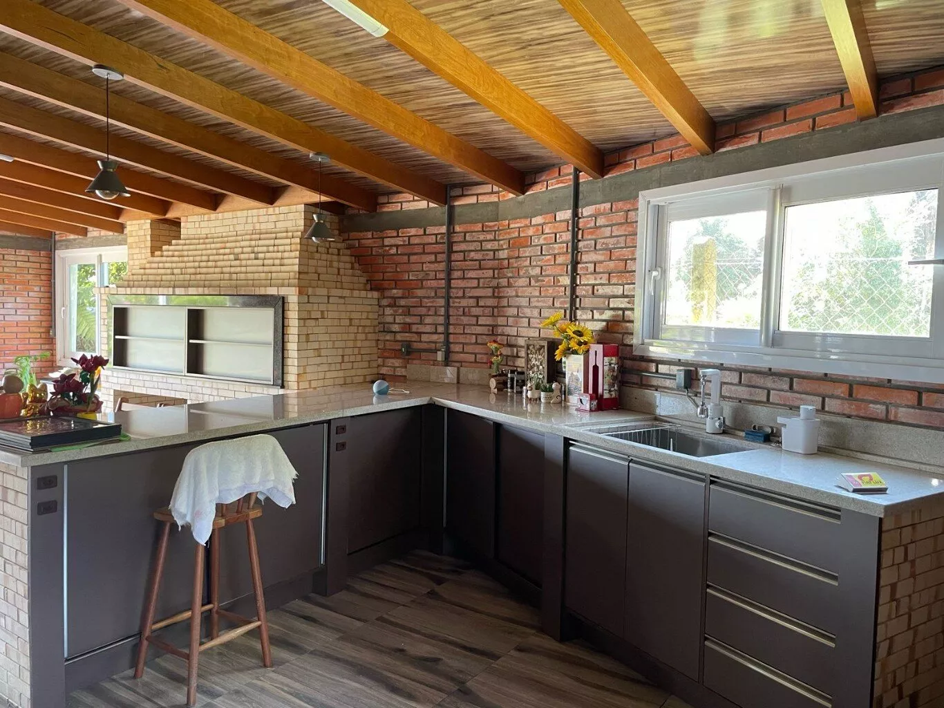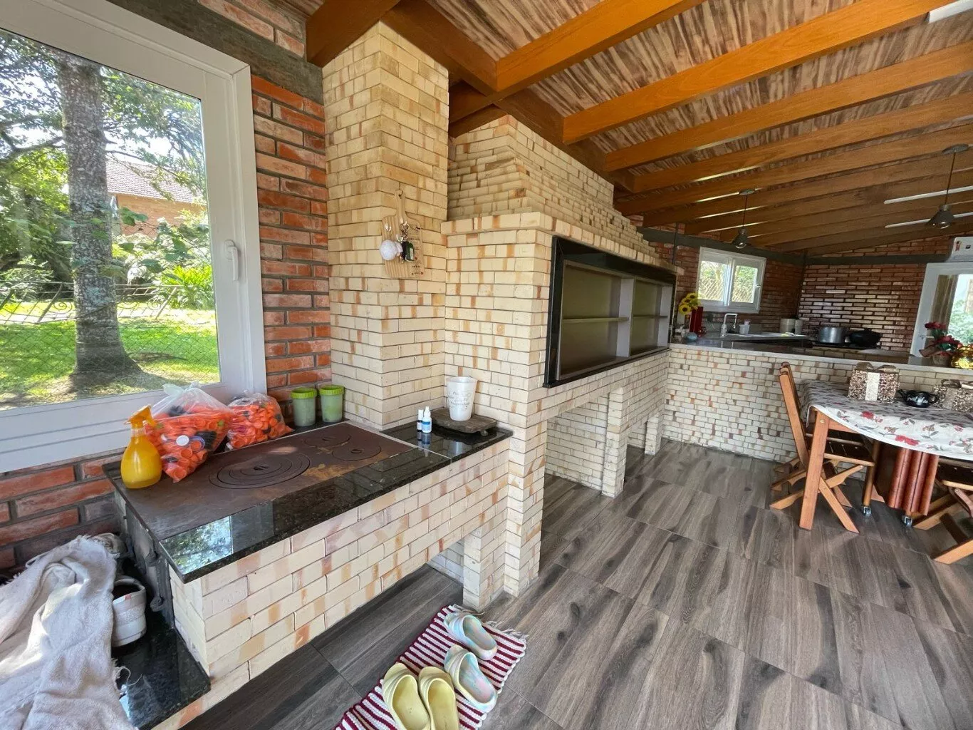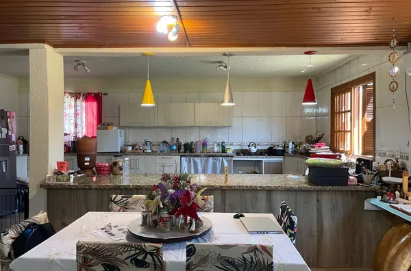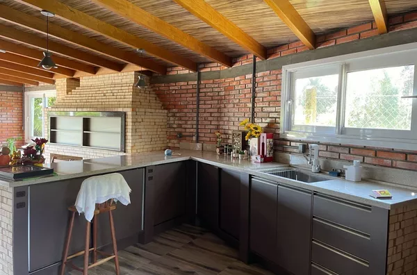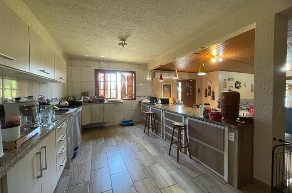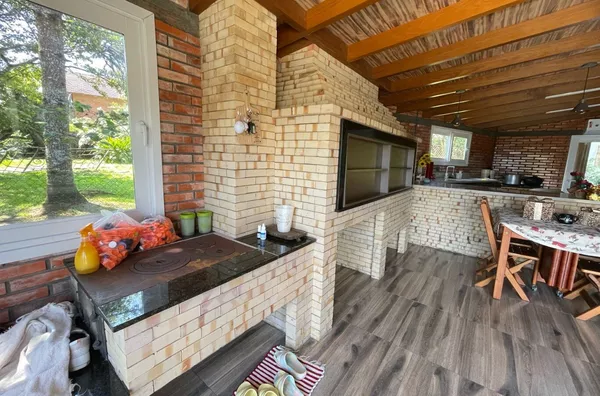 Ótimo espaço gourmet, bancada de granito, cuba Tramontina aço Inox, churrasqueira tradicional e de parrilla, fogão campeiro. Janelas com vidros duplos, portas de correr, frente e fundo, Alumínio Royale de alto padrão, com vidros duplos de 10mm, para preservar a temperatura e acústica do ambiente. 1 lavabo.