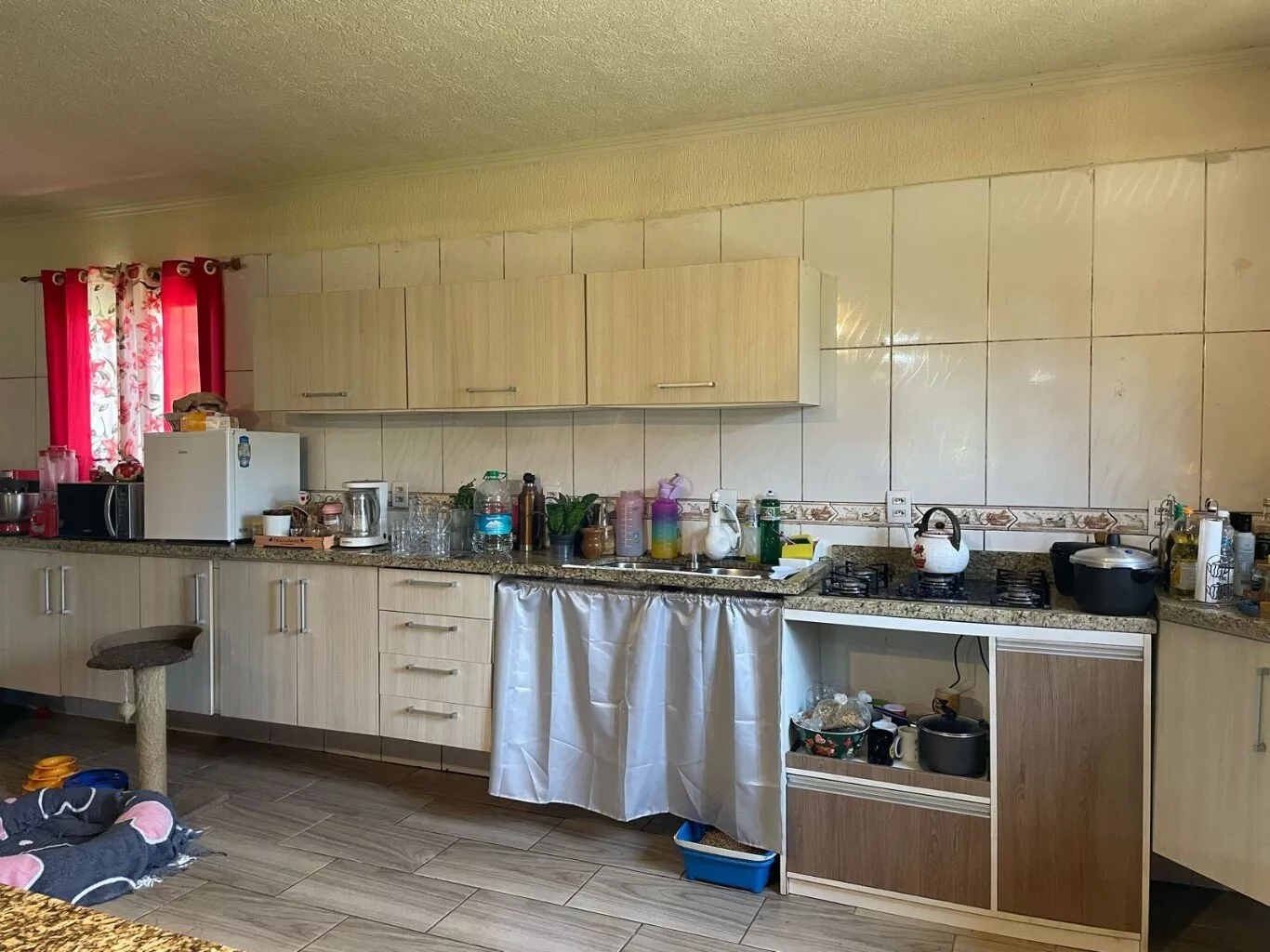 Casa composta por 2 dormitórios (sendo 1 suíte), cozinha e sala integrados com bancada de granito e armário embutido totalizando 11 gavetas. Armário aéreo na cozinha sob medida, 2 cubas, lavanderia com portas de vidro e porta de correr, de madeira, dividindo a cozinha da sala. 2 banheiros sociais.