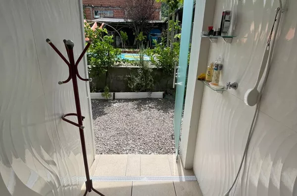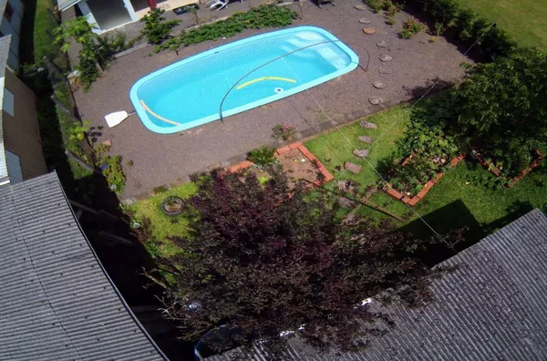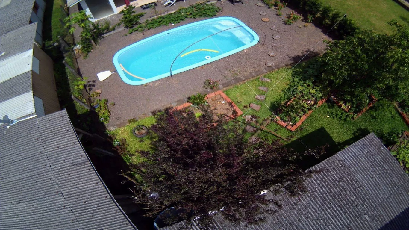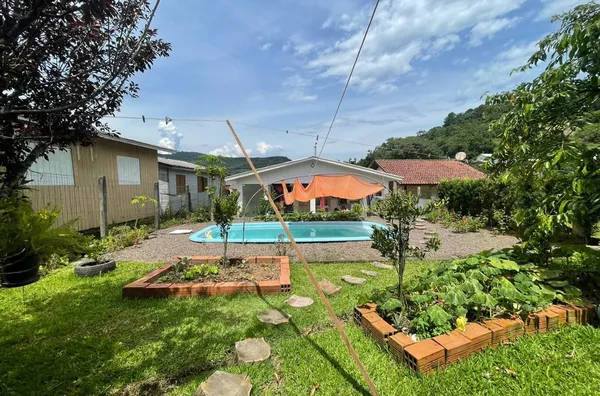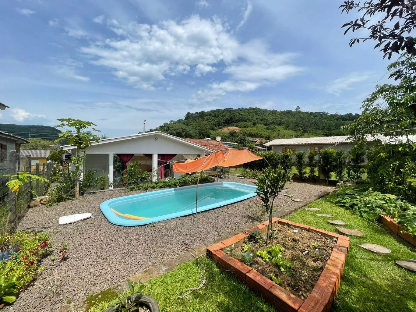 Frente, jardim com flores e grama, fundos com amplo espaço, jardim com flores, por mar de frutas, temperos e verduras, além de uma bela piscina instalada, em perfeito estado de funcionamento e manutenção.
