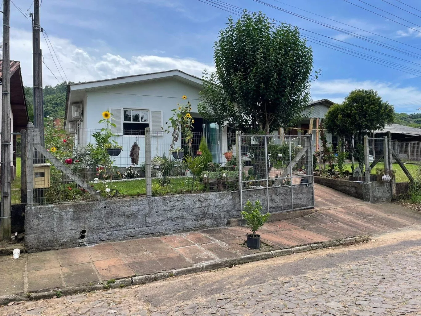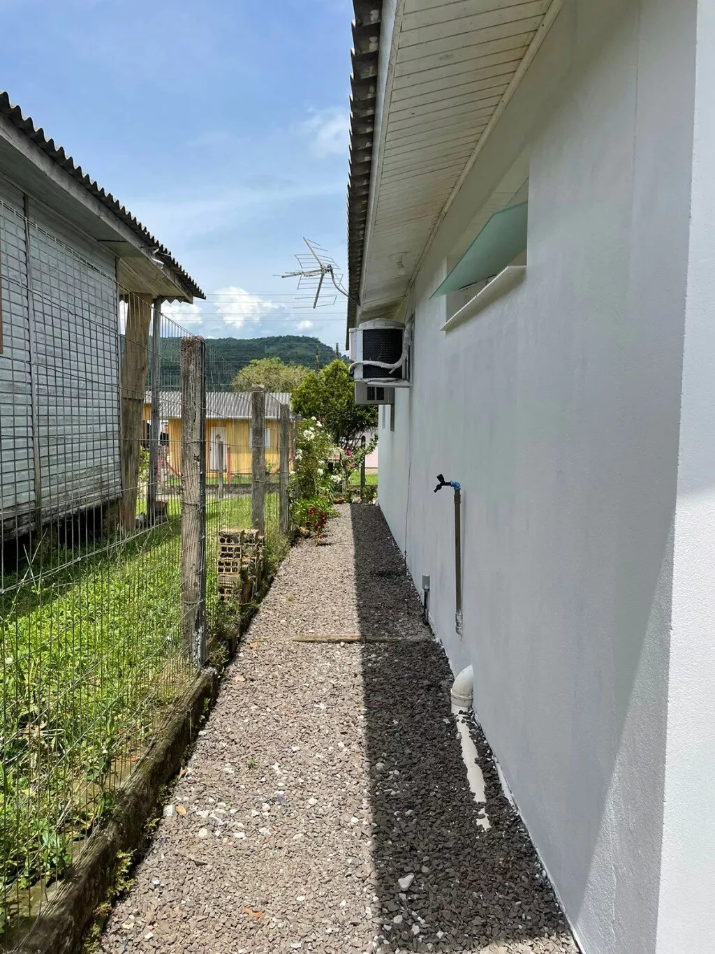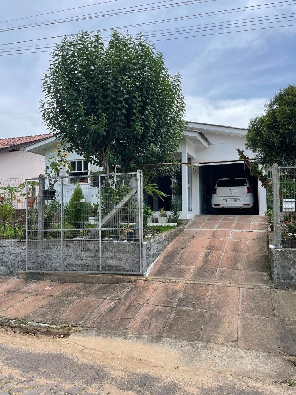 Pátio todo cercado com telas e mourões, porta da garagem de contra-peso.