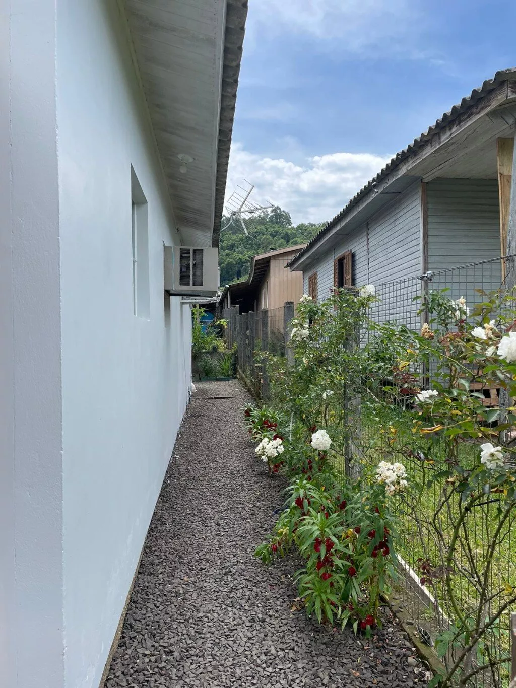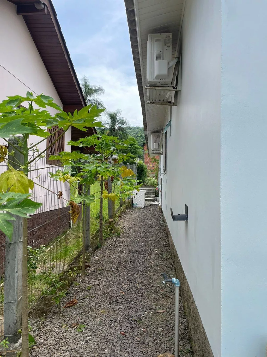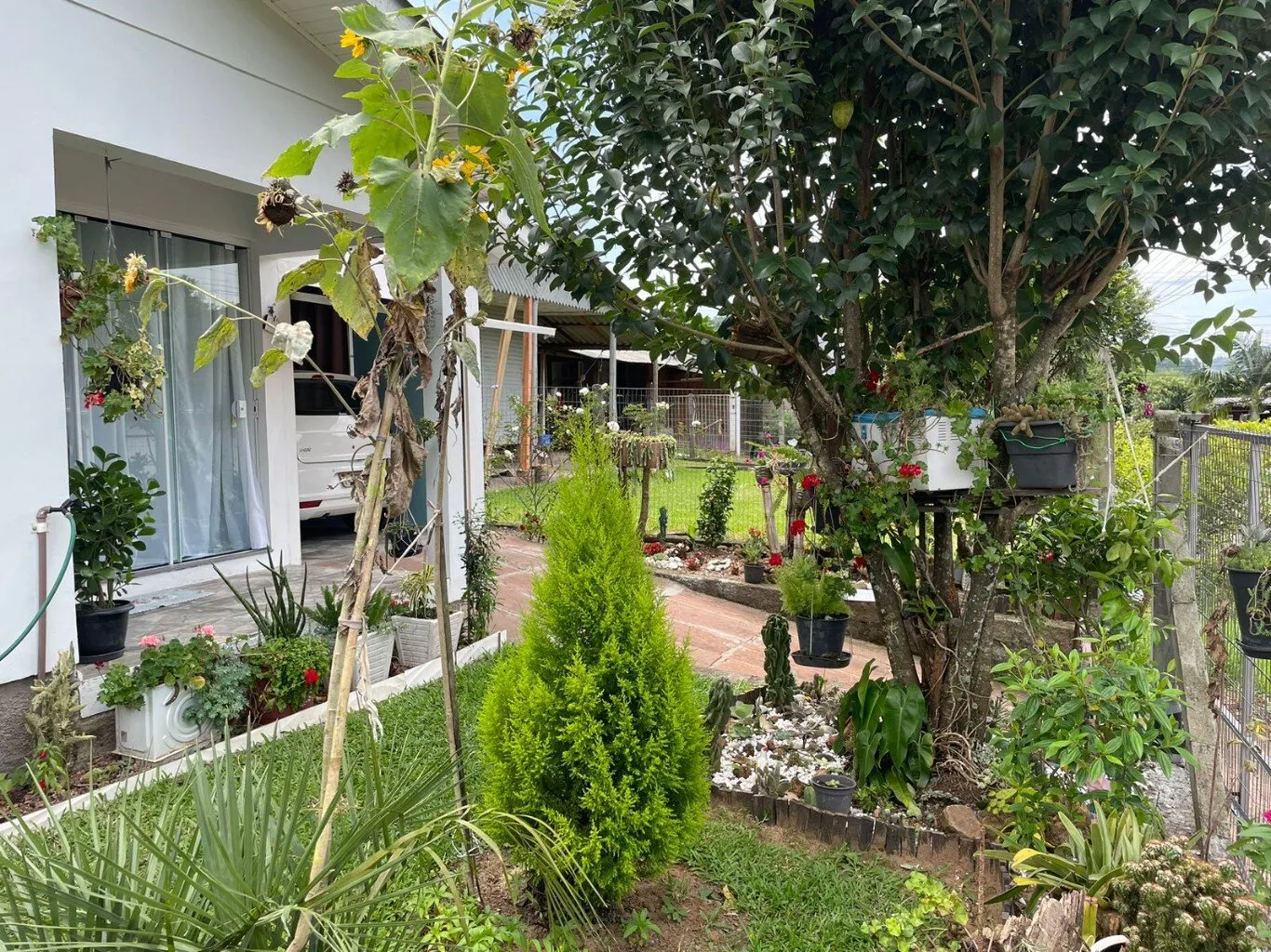 Pátio todo cercado com telas e mourões, porta da garagem de contra-peso.