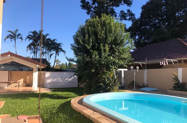 Piscina com quiosque, deck, e amplo jardim com grama e árvores frutíferas.