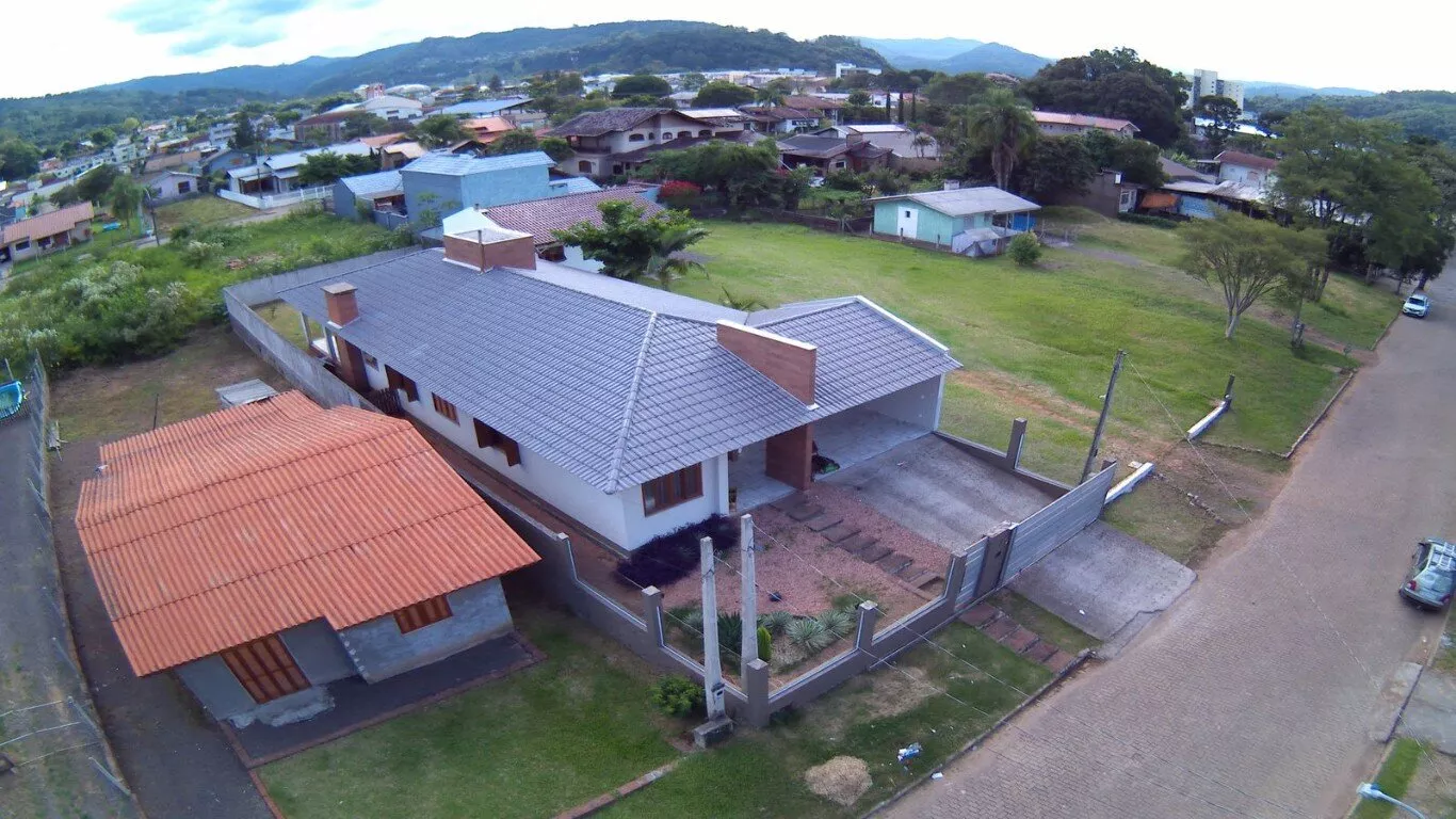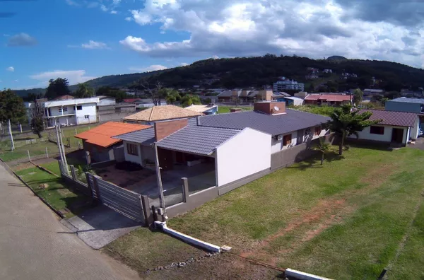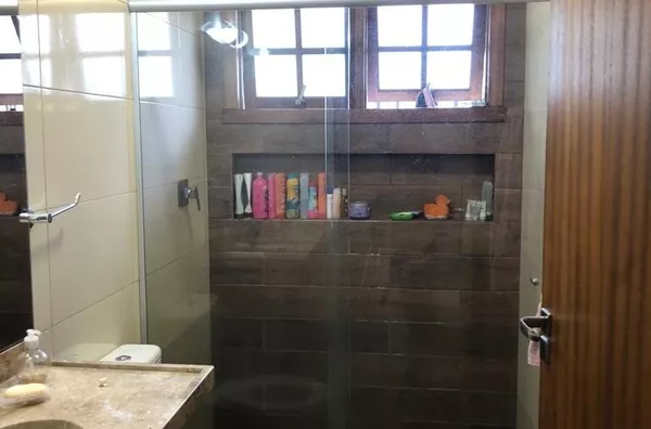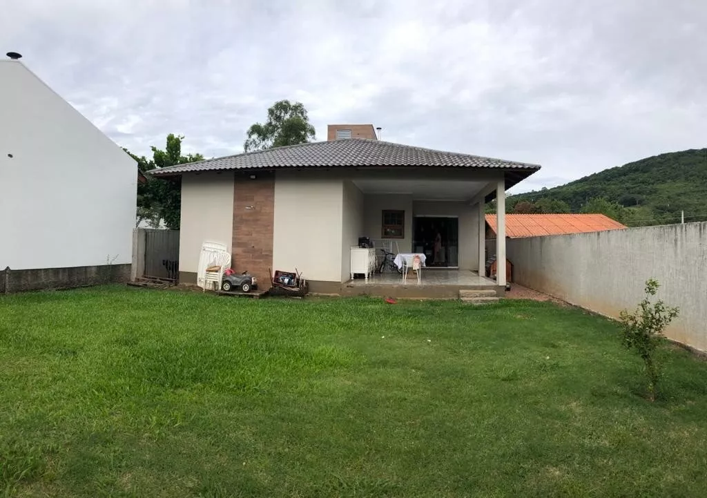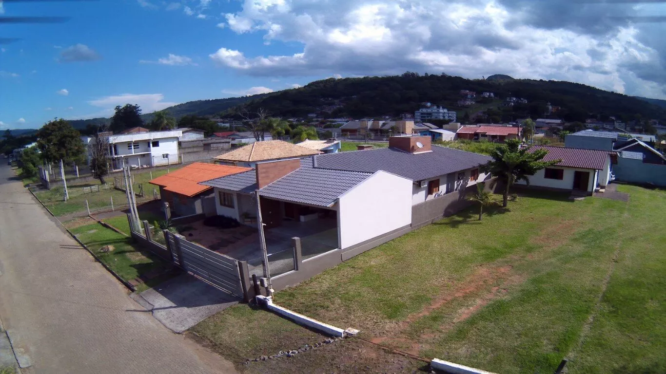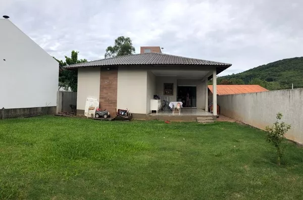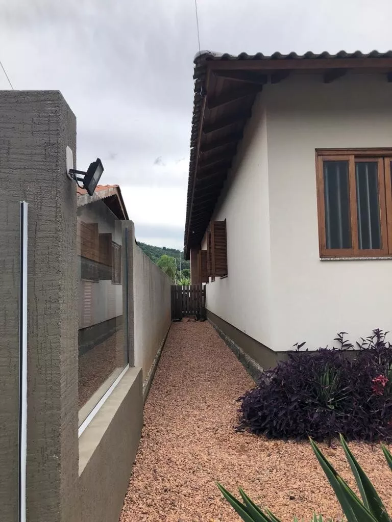 Casa em construção sólida, toda em alvenaria, muro em todo pátio e portões na entrada do terreno. Fachada com vidros e colunas de concreto. Nos fundos, terreno plano com grama.