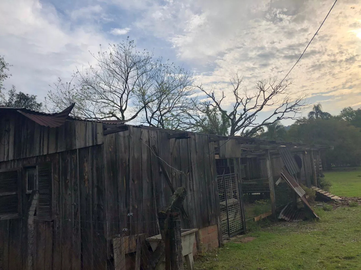 Terreno todo plano, cercado com telas, portão de ferro na frente.