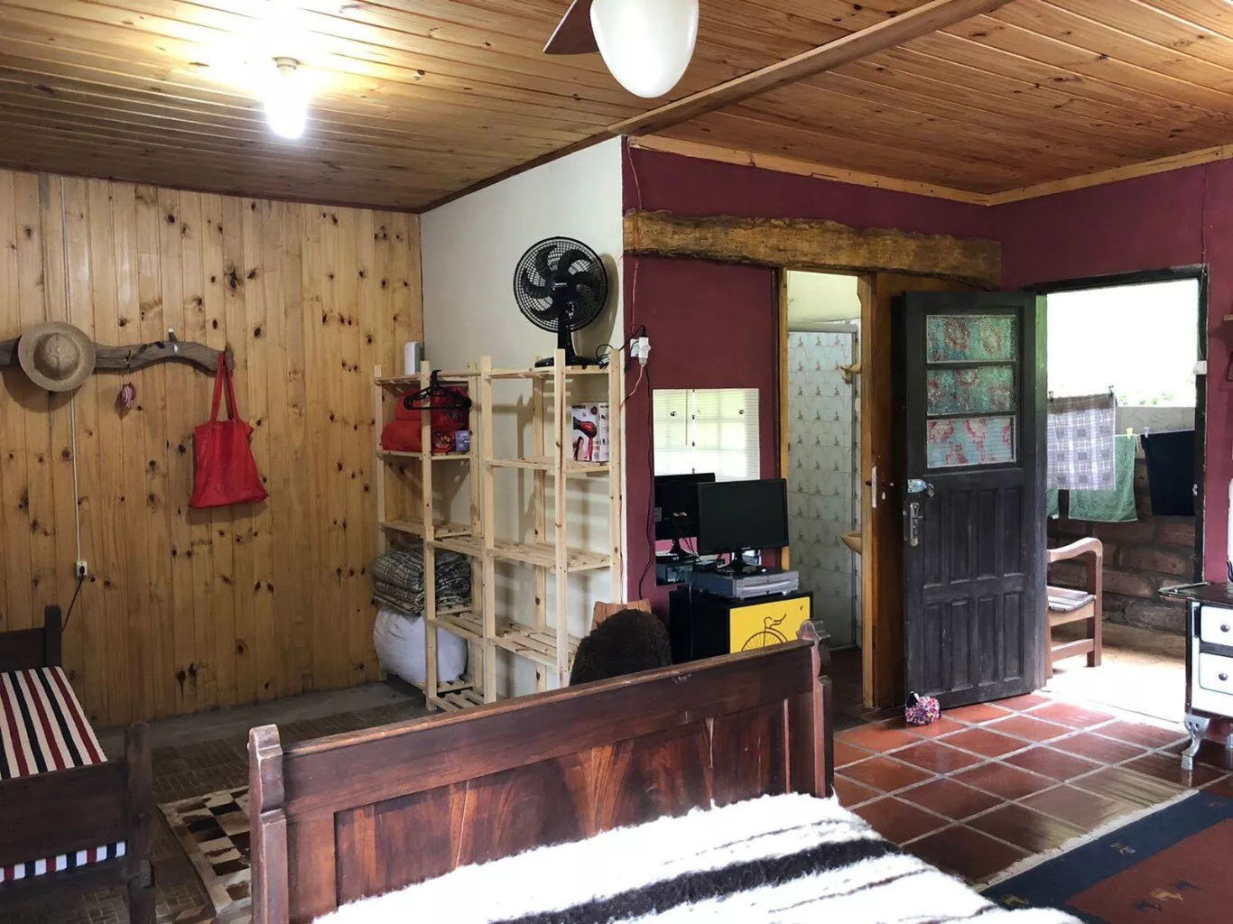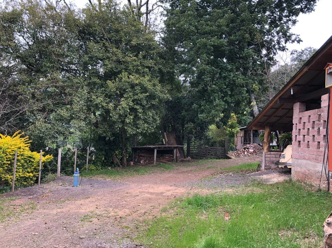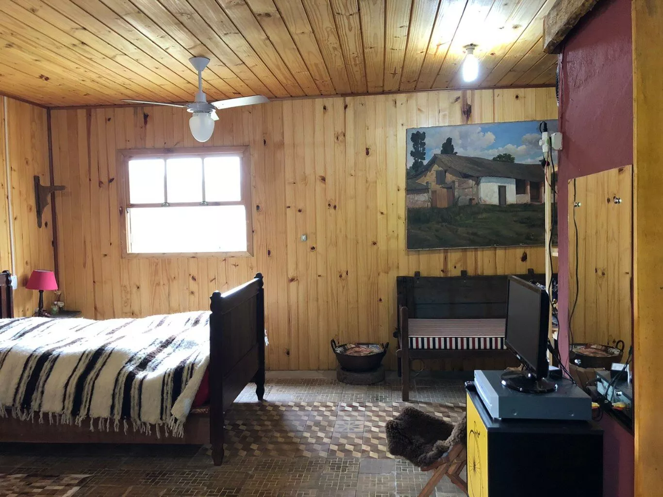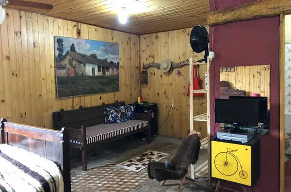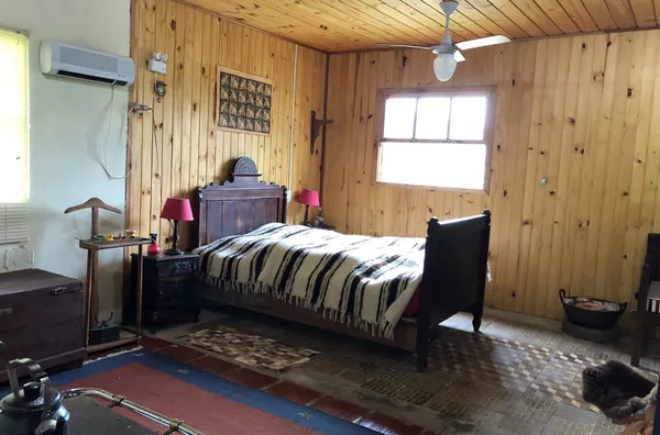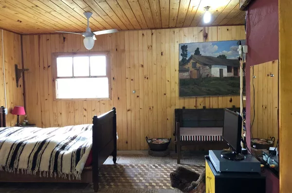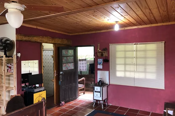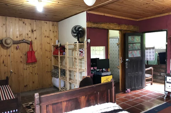 Casa principal de alvenaria com aproximadamente 105m² revestida de costaneiras, deixando o ambiente mais campeiro, composta por lareira, churrasqueira, cozinha e sala de estar integrados, lavabo, 1 dormitório sendo suíte (banheiro a gás) e closet em amplo espaço. Açude nos fundos, visto da janela do dormitório.
