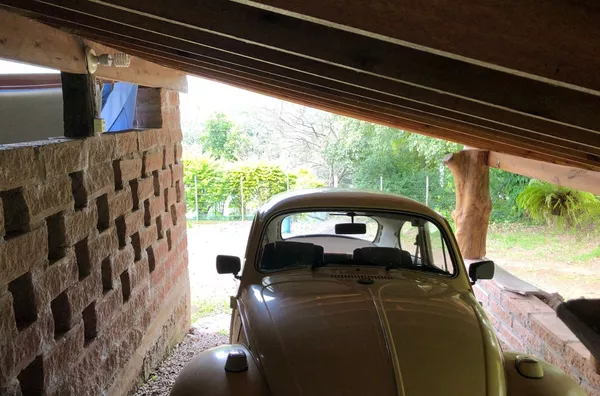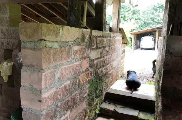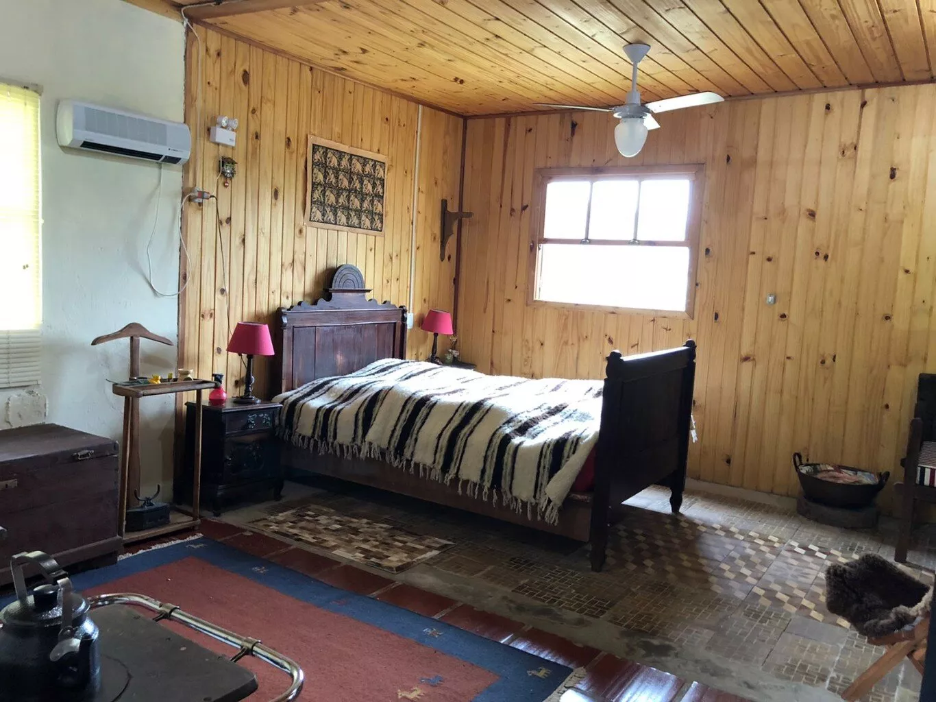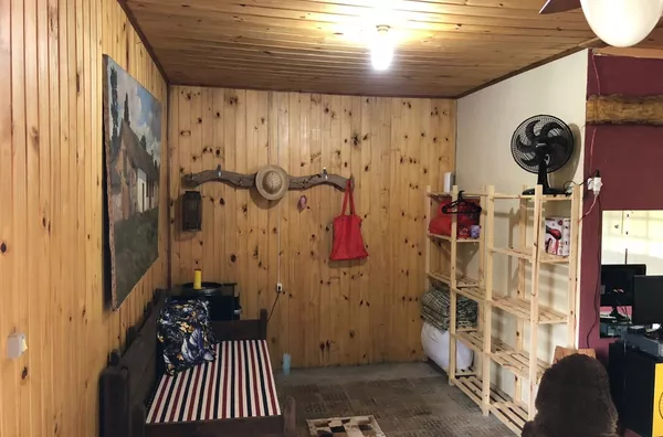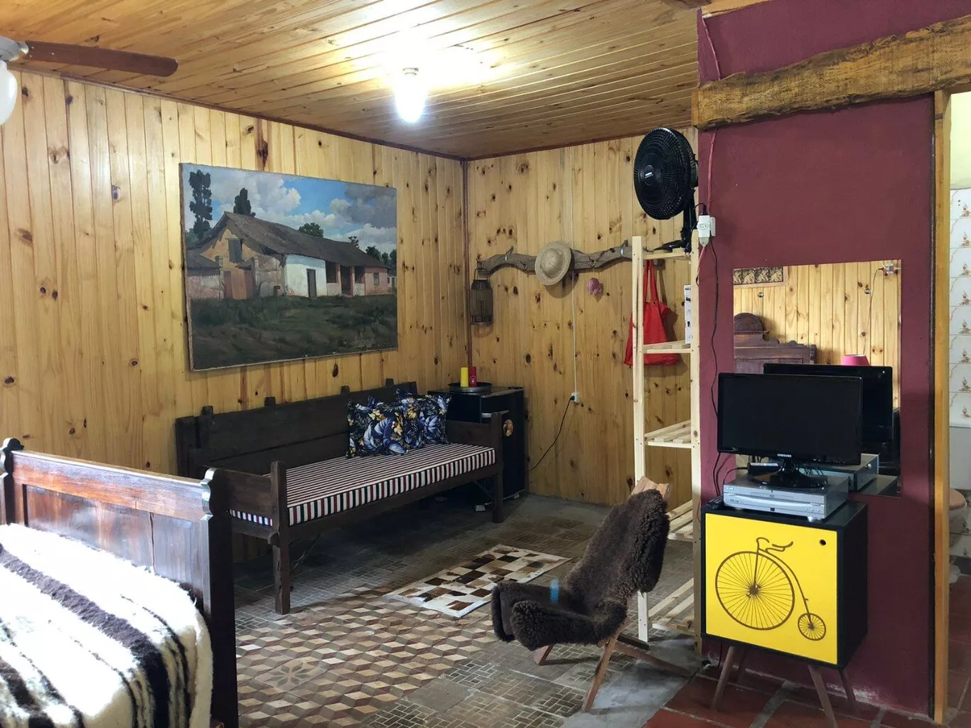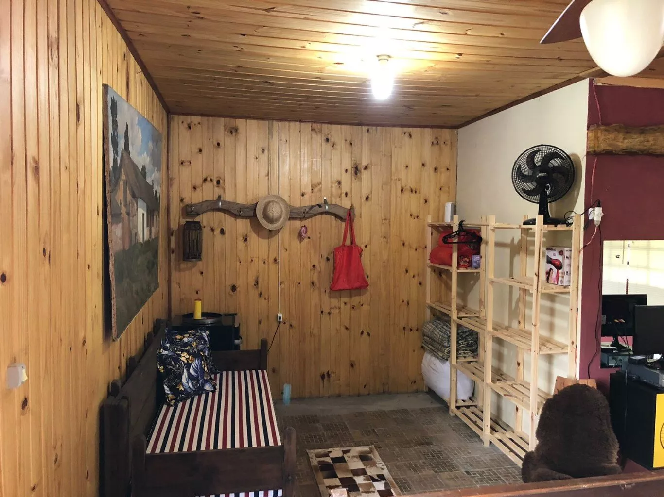 Casa principal de alvenaria com aproximadamente 105m² revestida de costaneiras, deixando o ambiente mais campeiro, composta por lareira, churrasqueira, cozinha e sala de estar integrados, lavabo, 1 dormitório sendo suíte (banheiro a gás) e closet em amplo espaço. Açude nos fundos, visto da janela do dormitório.