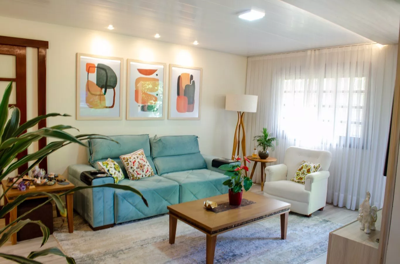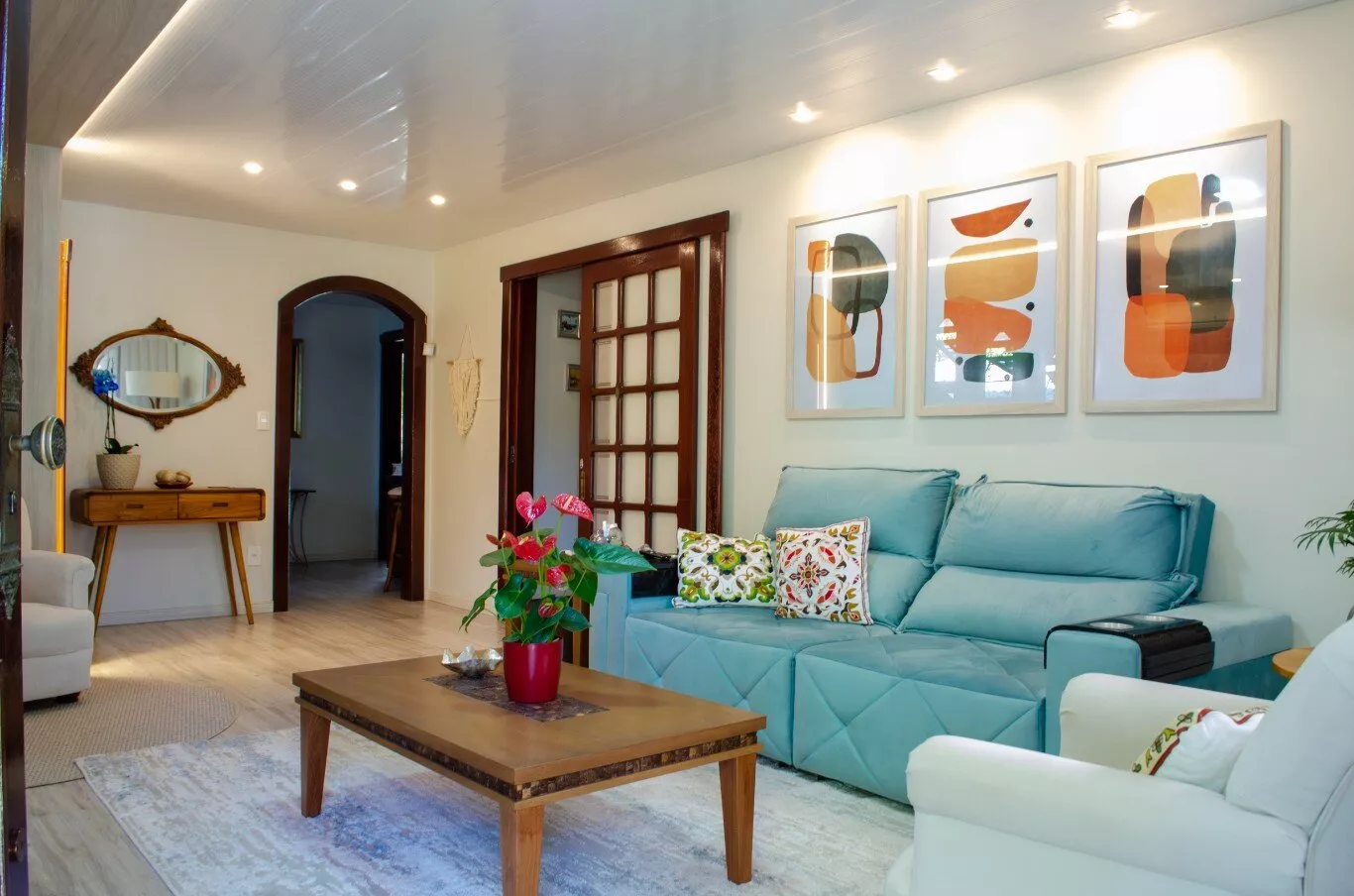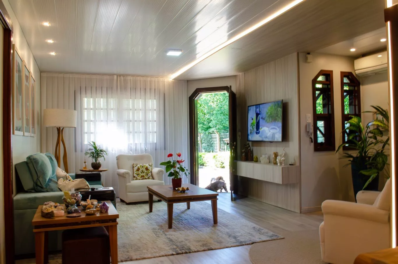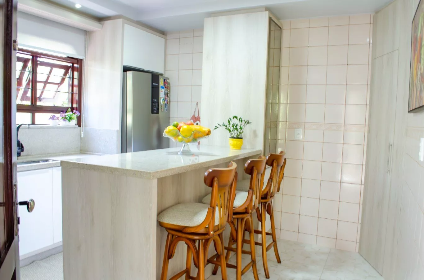 Casa de alvenaria com área de, aproximadamente, 400,00m², com dois pavimentos, sendo primeiro pavimento composto por sala de estar, sala de jantar, cozinha, depósito, uma (01) suíte, um (01) banheiro, área de serviço, garagem para quatro (04) veículos e churrasqueira. Segundo pavimento composto por cinco (02) dormitórios, sendo duas (02) suítes, duas (02) salas de estar, cozinha e área de serviço.